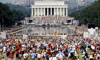 It was a beautiful day for the rally. Not only was it hot and sunny, but the air was filled with an energy that most people admit they had never felt before in their lives. My family and I spent the week-end in the DC, only blocks from the mall where the rally was to take place. We wanted to use the occasion to learn and to re-acquaint ourselves with history. From the minute we checked into the hotel, clerks and local folks were awestruck at the attendance in the city. They had never seen the city so packed and so busy. There wasn’t a single hotel room available in the city and not a single parking space. On every street were hundreds of people taking in the sights or getting something to eat, all in preparation of the big event on Saturday. People had come in from everywhere imaginable… Iowa, Michigan, Florida, Texas, Louisiana, Pennsylvania, Georgia, New Jersey, and others like ourselves, from North Carolina. These are just a few that we rode in the elevators with.