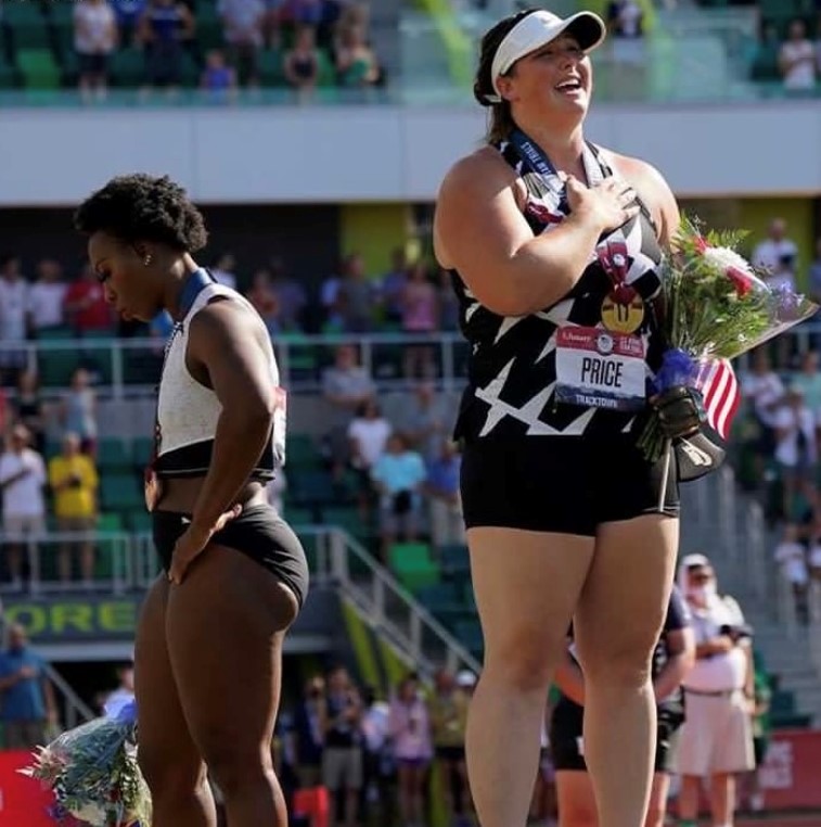 Gold and silver medalists DeAnna Price and Brooke Andersen faced the flag with their right hands over the heart while Berry faced away. She eventually picked up a black T-shirt with the words “Activist Athlete” printed on the front and draped it over her head. As she herself explains: “”My purpose and my mission is bigger than sports. I’m here to represent those … who died due to systemic racism. That’s the important part. That’s why I’m going. That’s why I’m here today.”